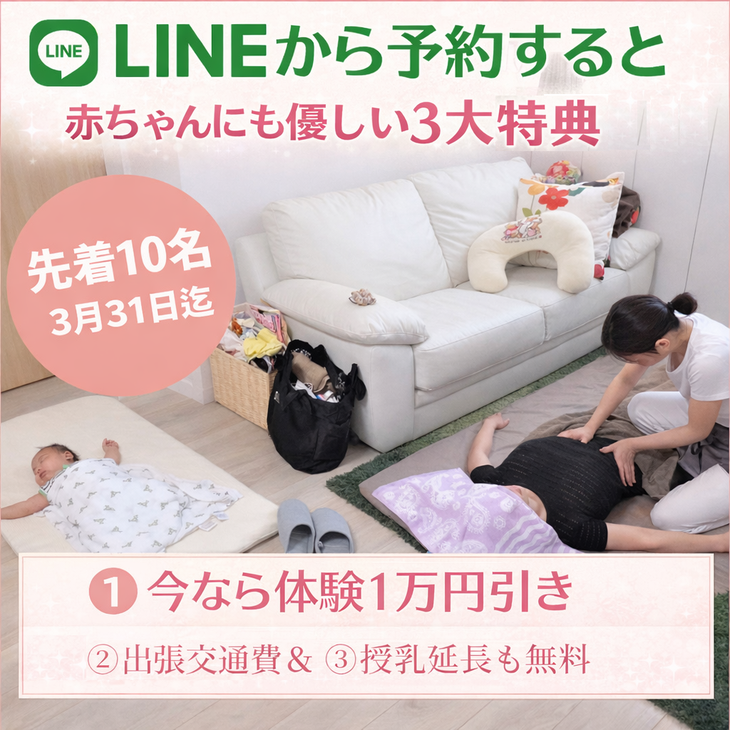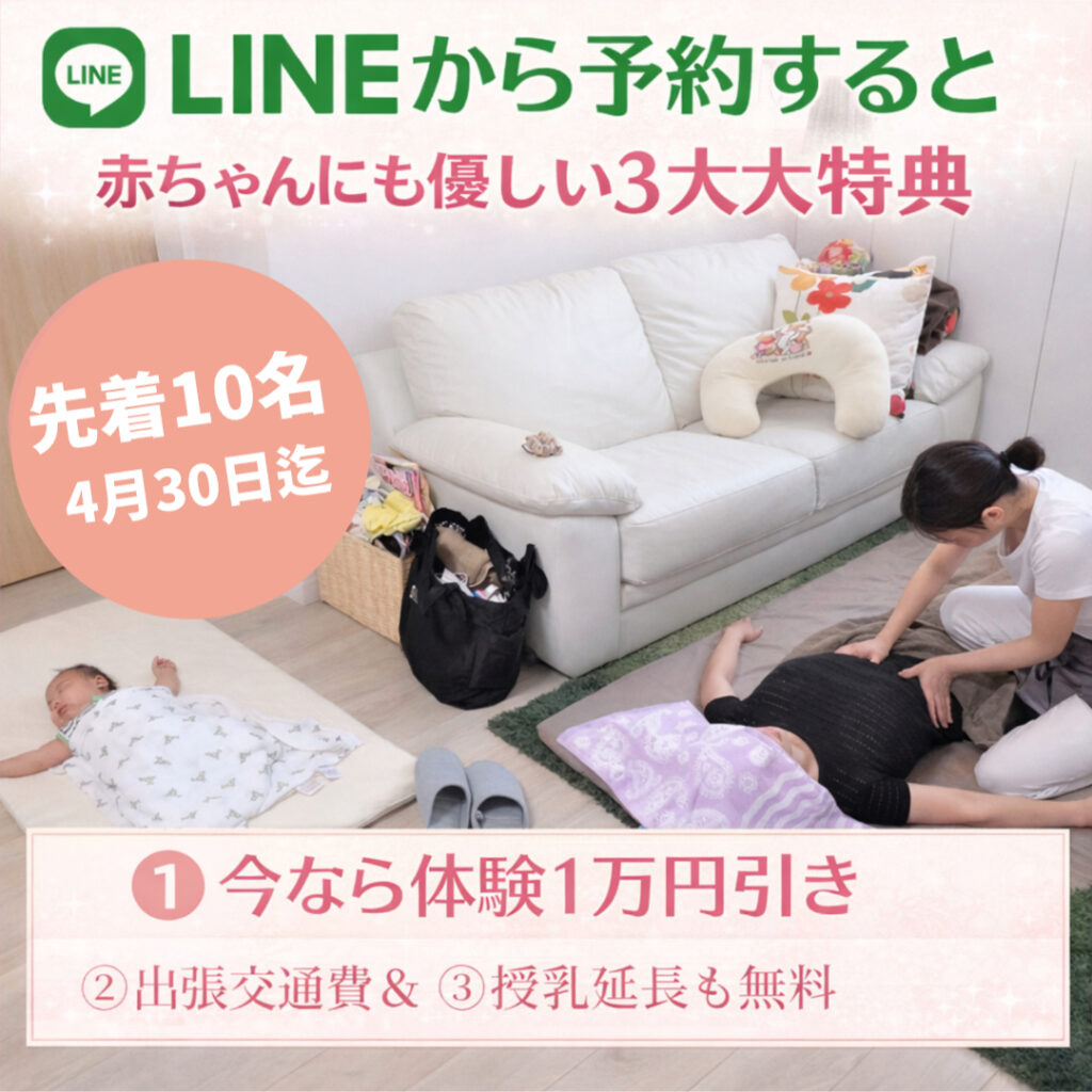 ※早めご希望の場合、産後の経過そのものが良好でうつぶせ寝可能でしたらご予約可能ですので遠慮なくお問い合わせください。