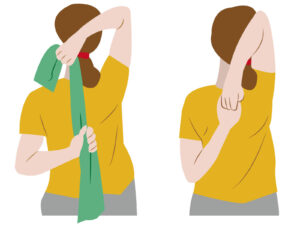 ①右手でフェイスタオルの片端を持ち、腕を上げて背中にたらす。