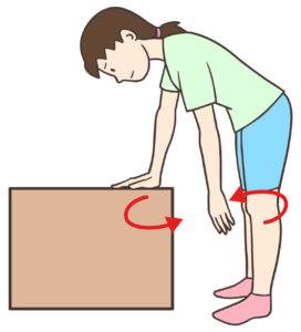 ①テーブルなどの横に足を肩幅程度に広げて立ち、片手をのせて軽く前かがみになる。