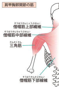 肩甲骨の上部と腕をつなぐ筋肉で、肩関節を安定させ、腕の動きをスムーズにするために重要です。